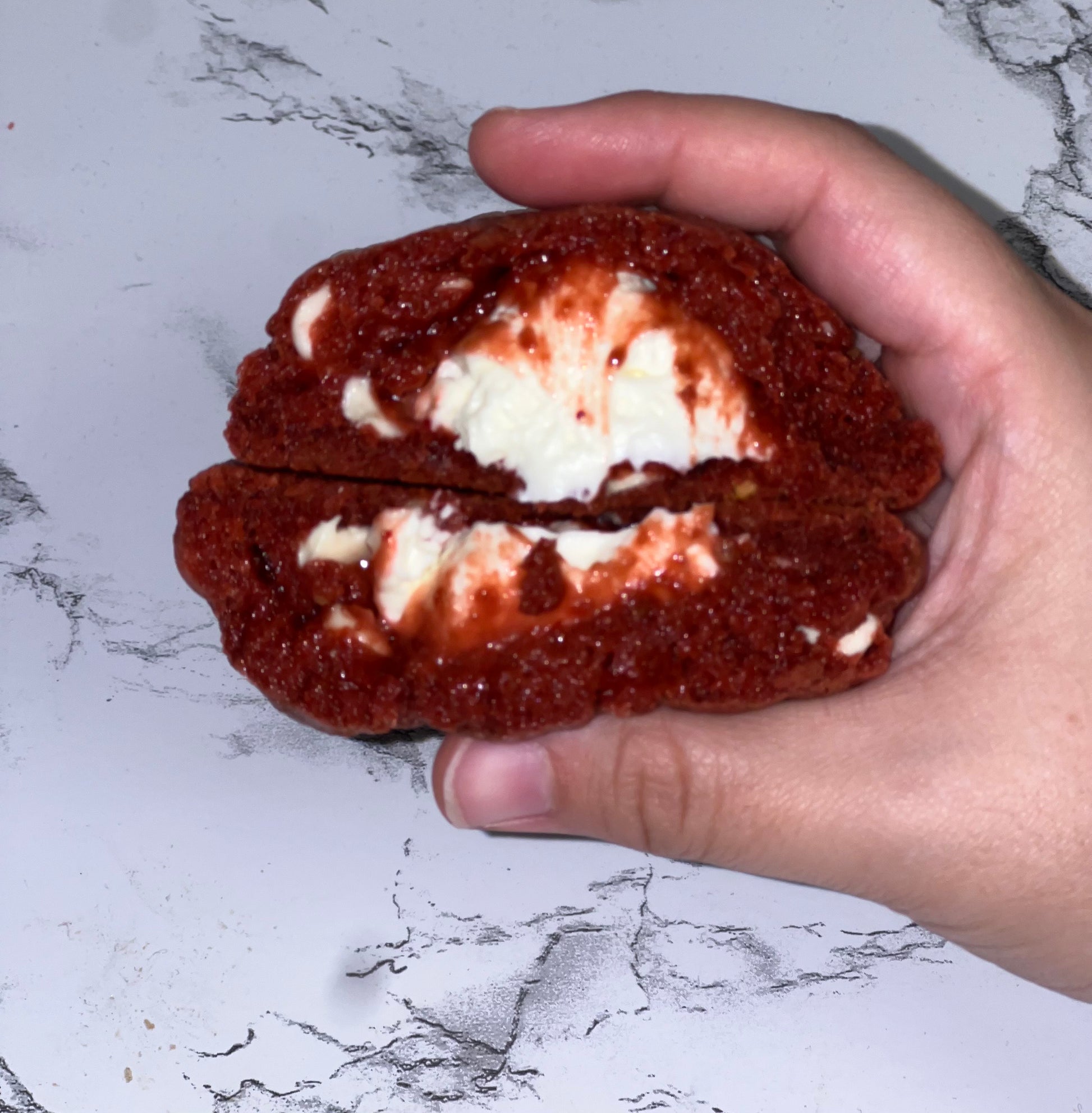 Chunky red velvet cookie with cream cheese chocolate chips and a cream cheese filling.